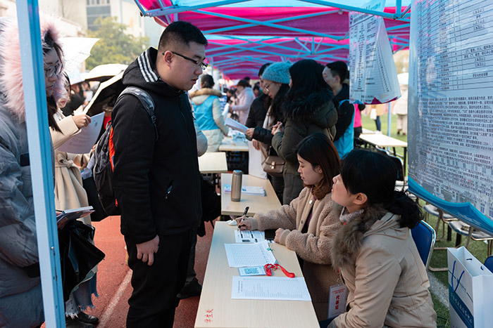 当日,共有来自北京、上海、江苏、浙江、安徽、广东、湖北、山东、新疆等18个省、市、自治区486家用人单位实现线上线下同步招聘,提供就业岗位近20000个。各用人单位现场摆放出招聘信息,招贤纳士,各招聘展位、服务咨询台前都围满了前来求职的学生。本次毕业生就业市场呈现出“一精准四多”特点:一是学校毕业生就业指导中心通过建立网上就业创业服务云平台,把学生的需求和用人单位的需求进行智能匹配,在网上实时、精准对接,方便毕业生通过平台订阅最新就业信息,网上投递简历,顺利实现就业。二是参会用人单位达到历史新高,比去年同期增长55%;三是组团招聘多,本次就业市场招聘单位近85%为省内外基层医疗单位,其中江苏省卫生人才交流服务中心、上海市青浦区卫生和计划生育委员会、青岛市卫生和计划生育人才综合服务中心、深圳市宝安区卫生和计划生育局、海门市卫生和计划生育委员会、盐城市大丰区卫生和计划生育委员会、安徽省宿松县卫生和计划生育委员会、衢州市卫生健康委员会等29个卫计委带队参加招聘。四是现场签约多,2日下午,学校共举办了近60场专场招聘会考试,宿松县卫计委、桐城市人民医院、海门市人民医院等省内多家医院联合当地人社部门、卫计委等多家部门来校组织学生考试、面试,对录取的学生现场签约,大大的提升了签约效率,节约就业成本。