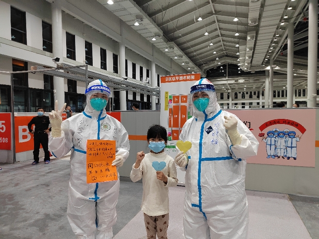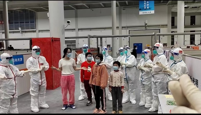 这时,舱内的一位漂亮小姐姐也加入到我们的队伍,带领小朋友们和队员们一起合唱“听我说谢谢你”,听着那句歌词“谢谢你,因为有你,温暖了四季”,队员们的内心无比的激动,隔着面屏,大家都流下了泪水。有了这次援沪的经历,大家对亲情有了更深刻的认识。