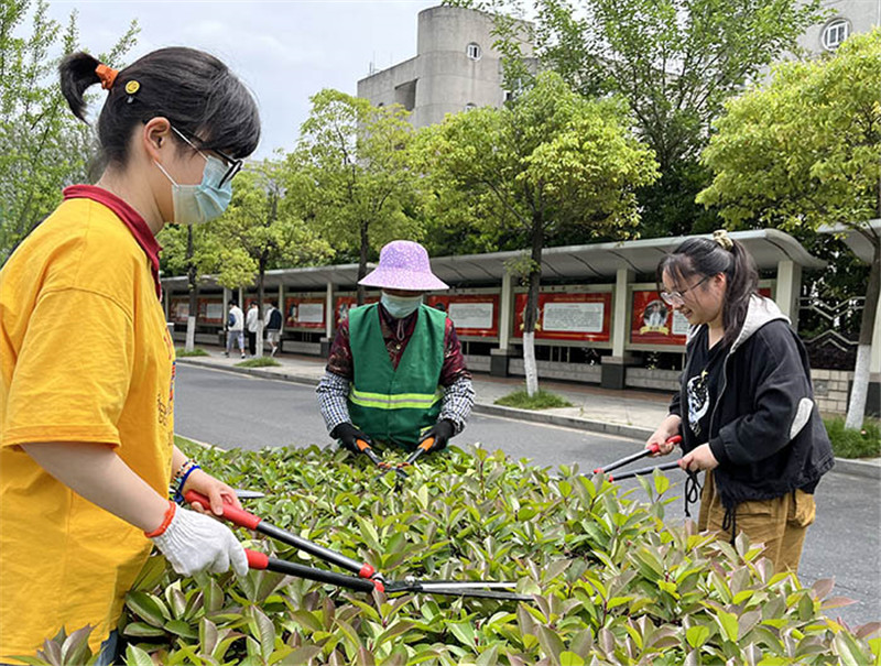 该校学子在绿化养护人员指导下修剪苗木。汪宇昕摄