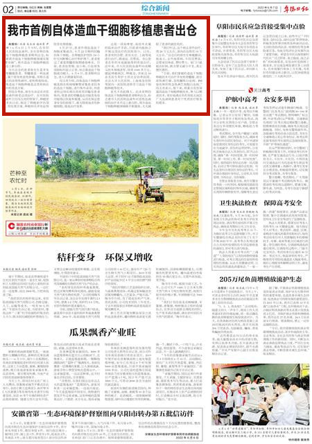 本报讯(记者 宋玉洁 通讯员 尹青峰)6月6日上午9时,在阜阳市人民医院血液科,全市首例自体造血干细胞移植患者顺利出仓,标志着我市造血干细胞移植领域实现“零突破”,我市造血干细胞移植技术迈上新台阶。