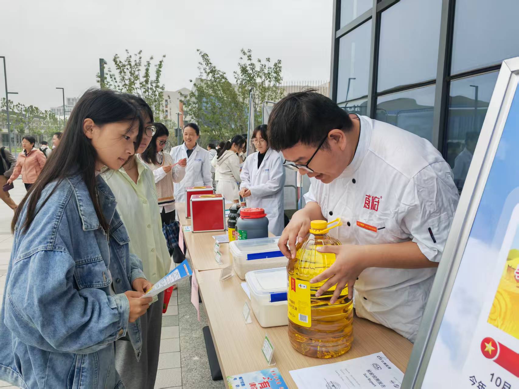 展示区和打卡区成为活动现场的“人气高地”。展示区,食堂亮出“当家产品”进行特色展示,工作人员逐一介绍食堂粮油品牌,通过观色泽、闻气味、看成分等方法,现场演示如何选购优质食材。打卡区采取光盘打卡并结合知识问答的形式开展,现场师生踊跃报名。“什么情况下土豆不能吃?”“每天最多只能吃几个皮蛋?”一个个小问题,将整场活动气氛推向高潮。